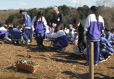 年度末に、草木で荒れ果てていた斜面をきれいにならし、そこに地元の中学生たちによって、もみじの木が植樹されました。
